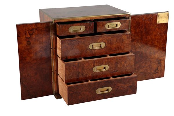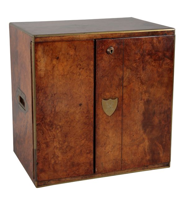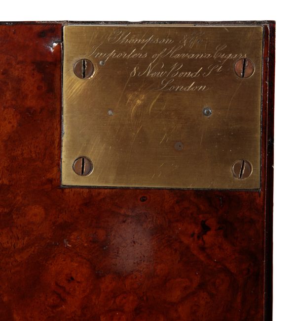 the inside of the locking plate inscribed 'Thompson & Co Importers of Havana Cigars 8 New Bond St London', with swing handles to each side, the doors opening to five lined drawers, 39cm high x 38cm wide x 27cm deep