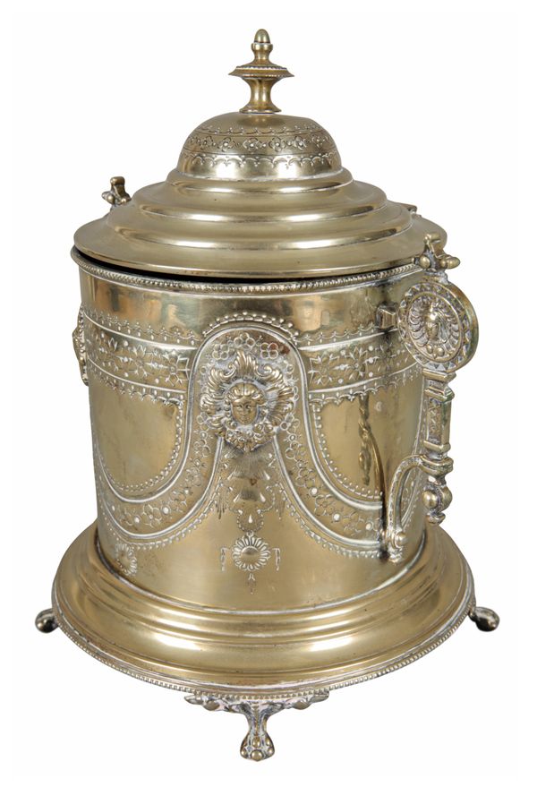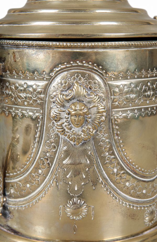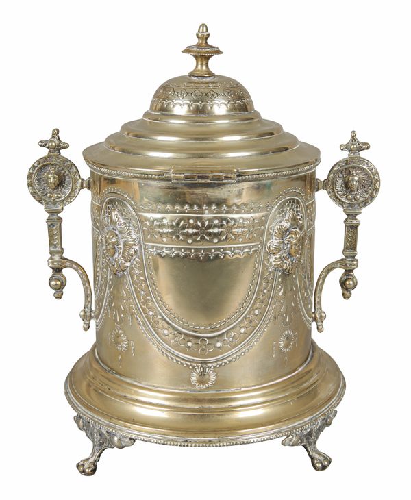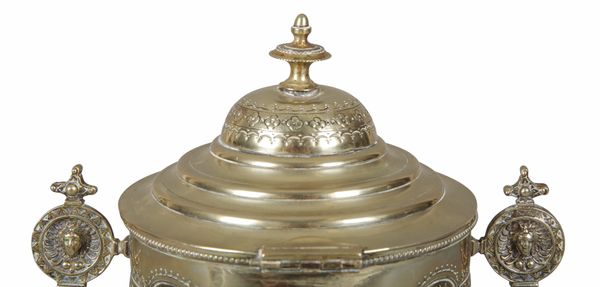 the domed cover with a turned finial opening to a silvered interior, the body decorated in neoclassical taste with masks and swags, two conforming handles to the sides, on lions paw feet, 24cm high x 21cm wide