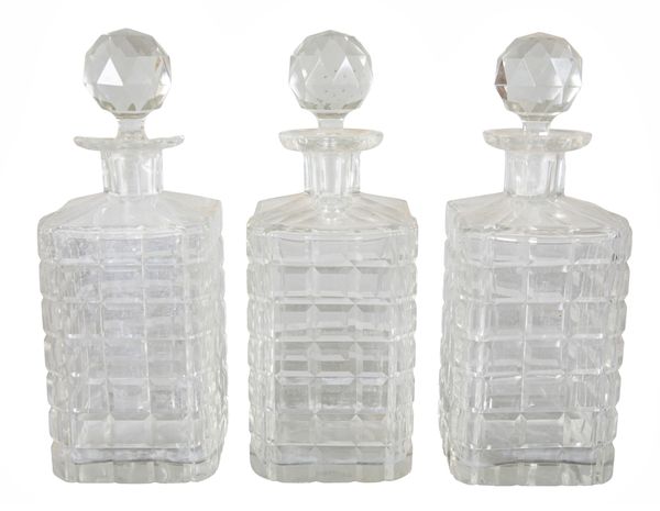 20th century, fitted with three cut glass square decanters, 32cm high x 35cm wide x 13cm deep; together with a cut glass ship's decanter, with a wide flate base, 23cm high (2) Provenance: The fittings of a Mediterranean yacht.