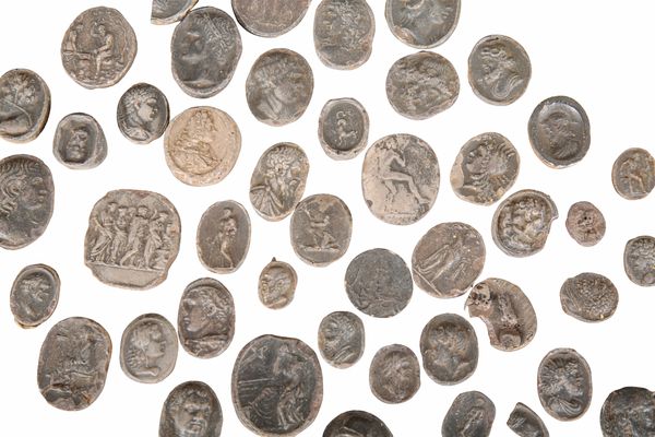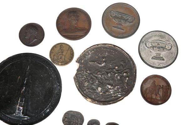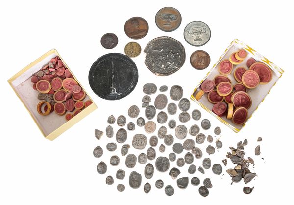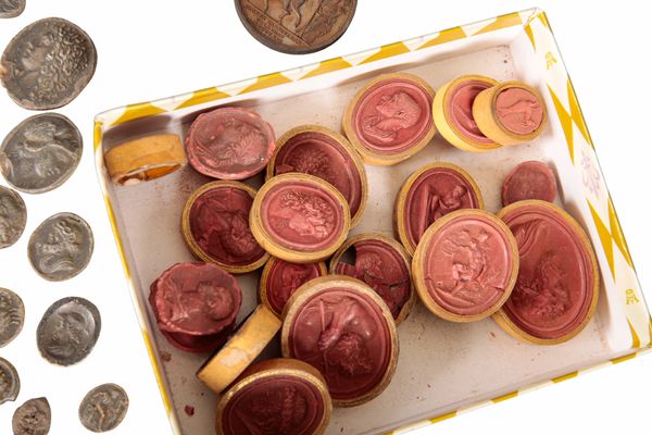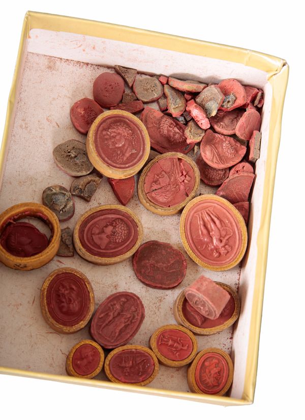 19th century and later, including a large group of plaster cameos depicting neoclassical scenes or profile studies, a large group of red wax cameos, again including portrait busts and classical figures, further wax cameos; together with a small collection of metal medallions (a lot)