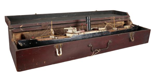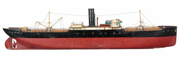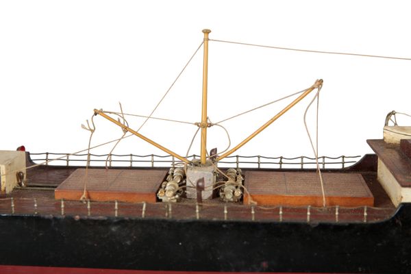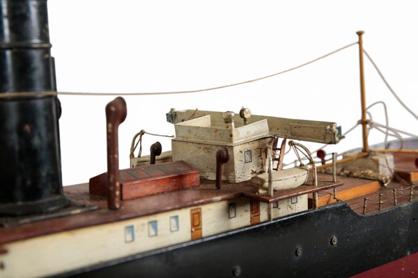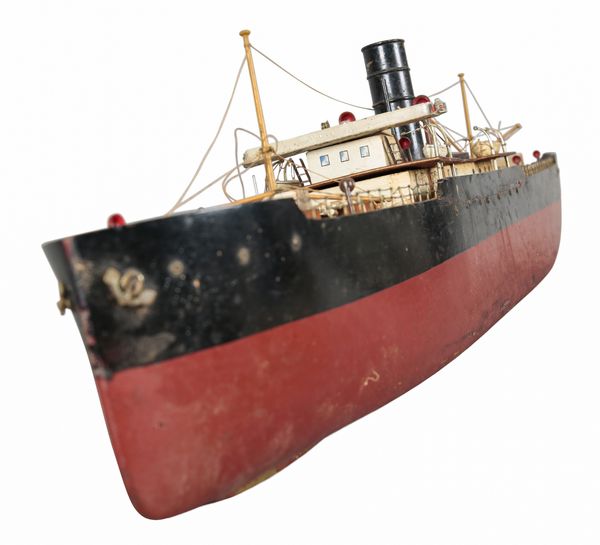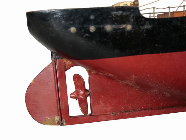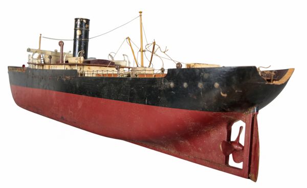 A POLYCHROME PAINTED WOOD AND TINPLATE CLOCKWORK STEAM SHIP