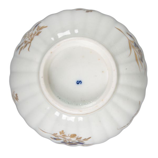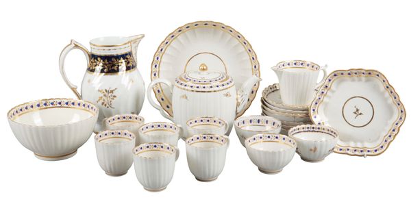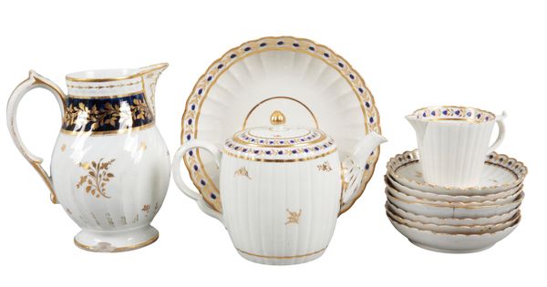 late 18th century, pattern 202, of gadrooned form and scalloped rim, decorated with gilt and polychrome floral bands, including a teapot, 14cm high x 20cm long x 13cm wide, a slop bowl, two plates, six teacups and seven saucers, a jug, and three small bowls; together with a similar jug with blue ground and enriched with floral gilding (22)