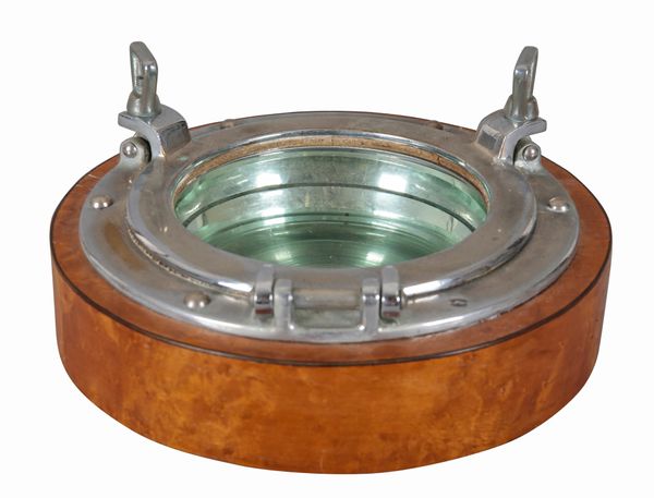20th century, the chromed metal window fixed holding a glass bowl with a mirrored base, mounted in a burrwood stand, 30cm diameter Provenance: The fittings of a Mediterranean yacht.