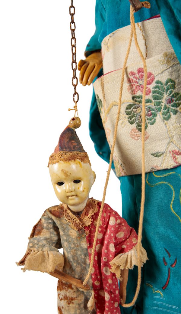 19th/20th century, modelled wearing a blue gown holding the strings of a puppet in her hands, on a plinth base, 65cm high overall Provenance: The Graham Snow Collection.