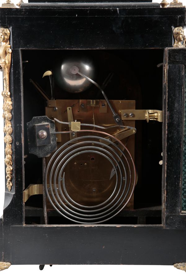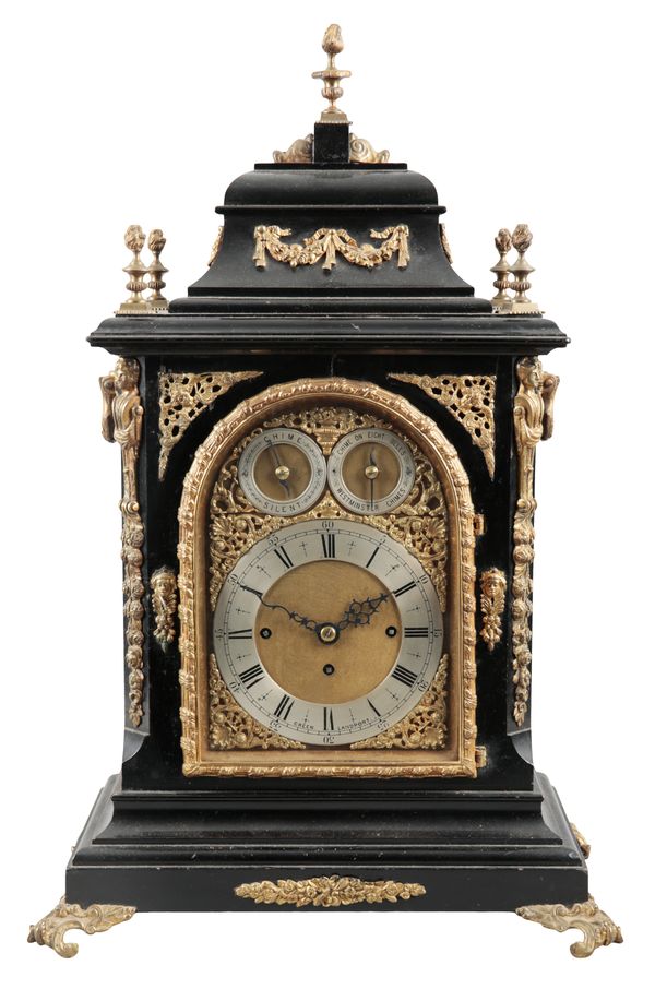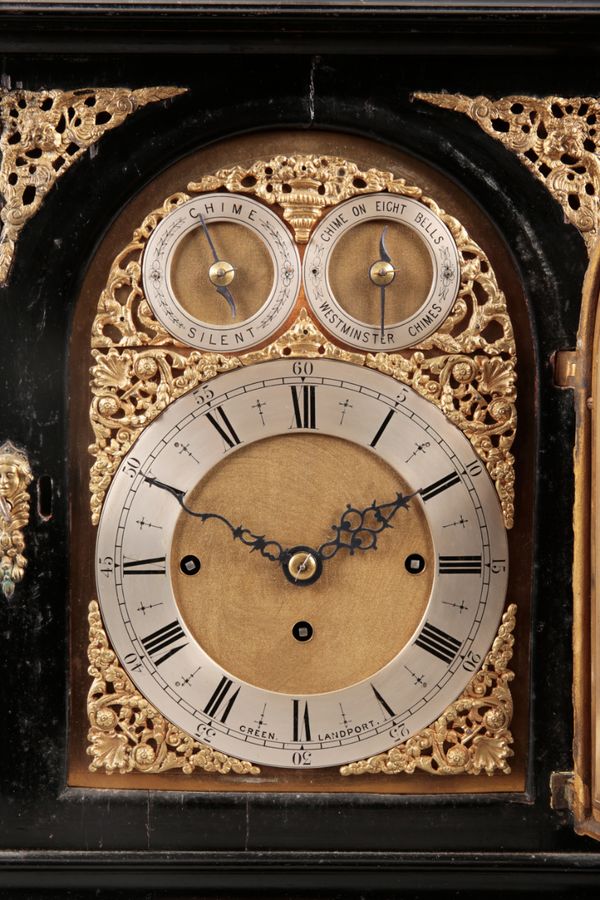 the three train fusee movement with Westminster or Eight Bell chimes, the silvered dial with Roman numerals signed 'Creen Landport', the case with flambe finials, a caddy top, swing handles to each side and scrolled bracket feet, 73cm high x 47cm wide x 29cm deep
