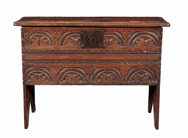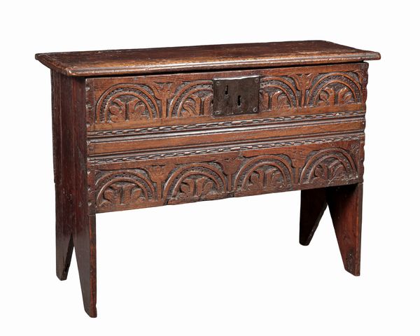 17th century, the hinged lid opening to a vacant interior, the front carved with stylised floral banding, 50.5cm high x 69cm wide x 27.5cm deep