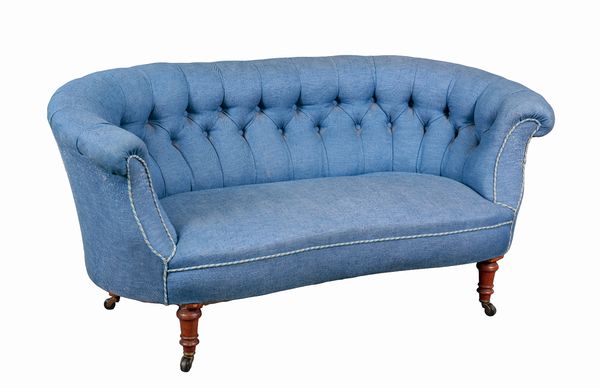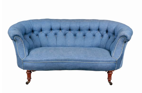 with button back blue covers, on turned front legs and castors, 73cm high x 158cm wide