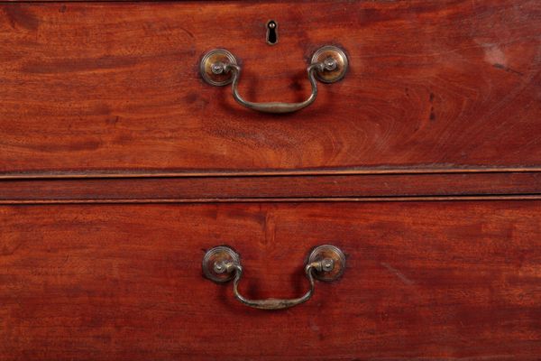 the upper section with a dentil moulded cornice over cupboards opening to a vacant interior fitted with a rail, the base with two short faux drawers and two long graduated drawers, on splayed bracket feet, 181.5cm high x 127cm wide x 59cm deep