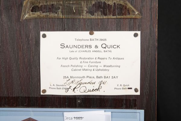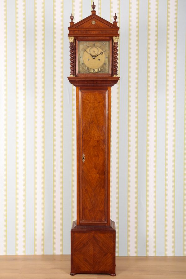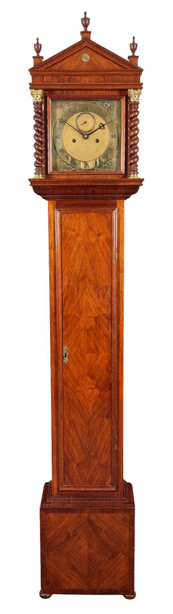 the two train movement striking on a bell, the brass dial with a subsidiary second dial, etched floral sprays to the spandrels, signed in banners to the bottom corners, and with Roman numerals to the chapter ring, in a later case, the architectural hood with three urn finials over a triangular pediment, barley twist columns to each side, on compressed bun feet, 220cm high x 41cm wide