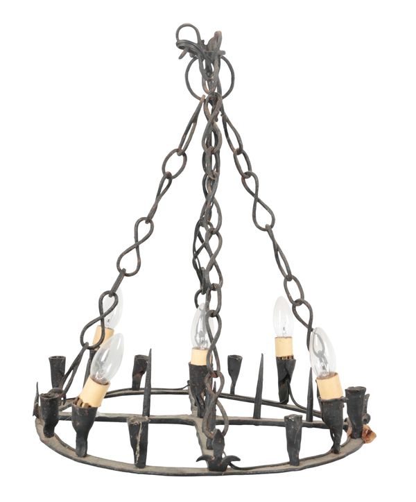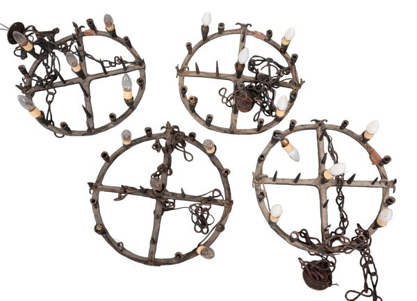 A SET OF FOUR WROUGHT IRON CHANDELIERS