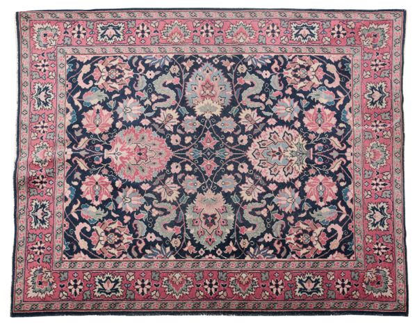 woven in turquoise, pink and other colours with endless Shah Abbas design on a dark blue ground, with conforming borders, 151cm x 123cm, woven in tag dated 1956, the back further stencilled 201956
