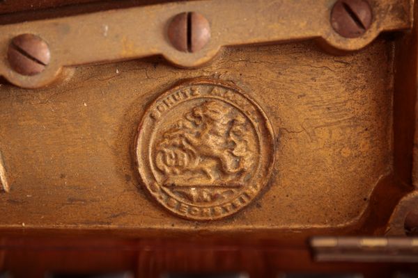 inscribed number '116660' to the gilt cast iron frame, on tapered square legs joined by stretchers and terminating in brass castors, 99cm high x 145cm wide x 182cm deep Ivory Submission Reference: 7D1DBRBC