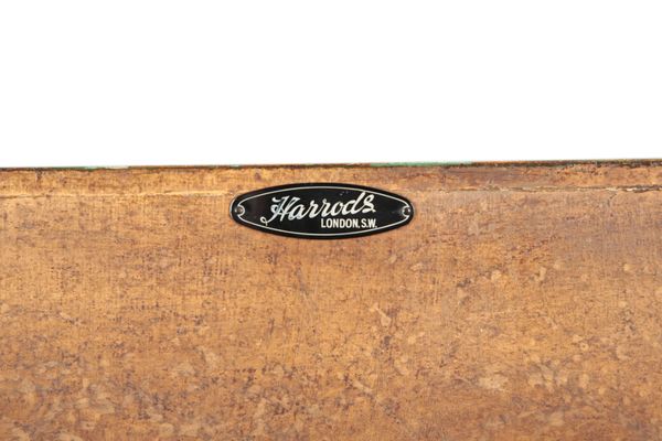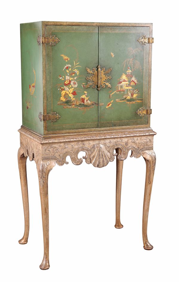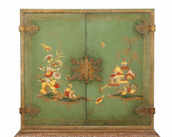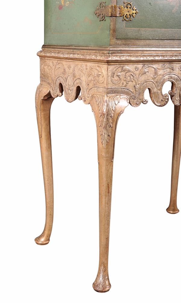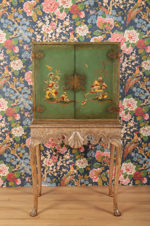 retailed by Harrods, London, 20th century, decorated in the chinoiserie taste with figures and pagodas in a mountainous landscape, opening to a shelved interior, the giltwood stand with carved frieze and cabriole legs on pad feet, 149.5cm high x 80cm wide x 50cm deep