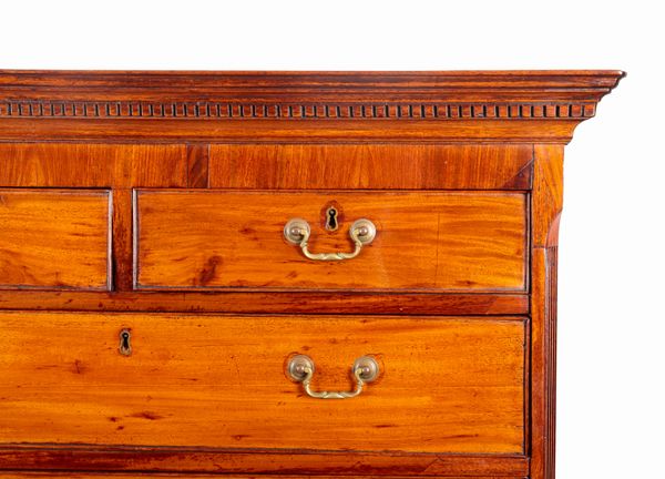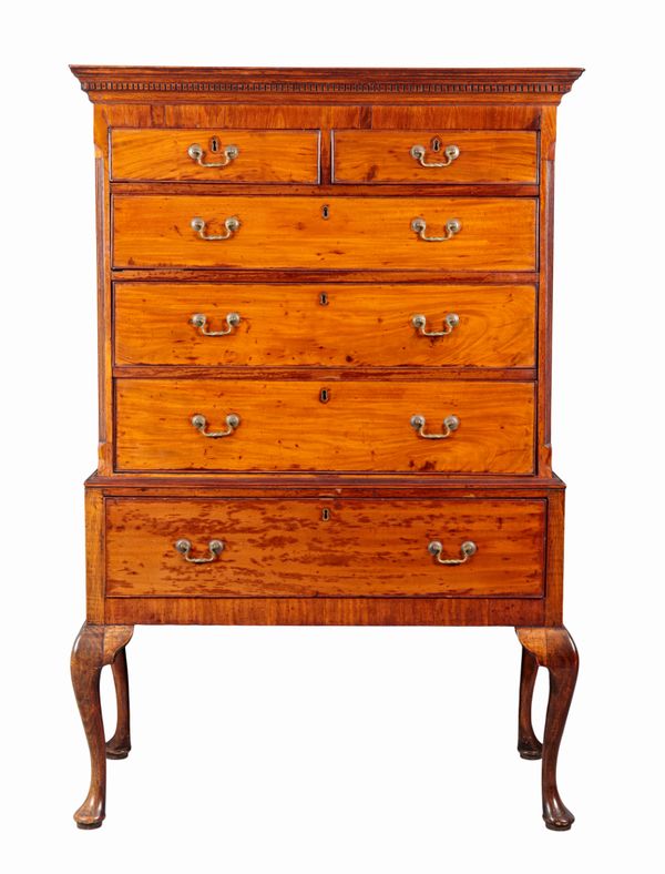 the upper part with a dentil moulded cornice, canted and fluted front corners and fitted with five drawers, the stand fitted with a single drawer on cabriole legs and pad feet, 168cm high x 113cm wide x 56cm deep