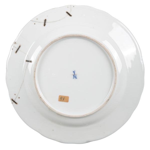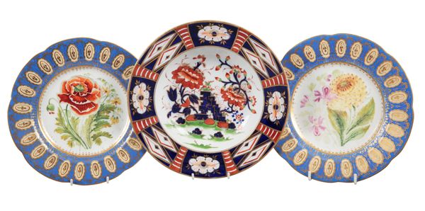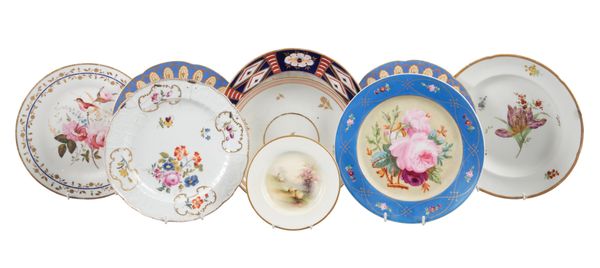 late 18th century and later, comprising an example bearing an underglaze crossed swords mark, 'Coalport Improved Feltspar Porcelain', a Royal Worcester decorated with sheep amongst a pastoral landscape, and others, typically measuring 24cm diameter (9)