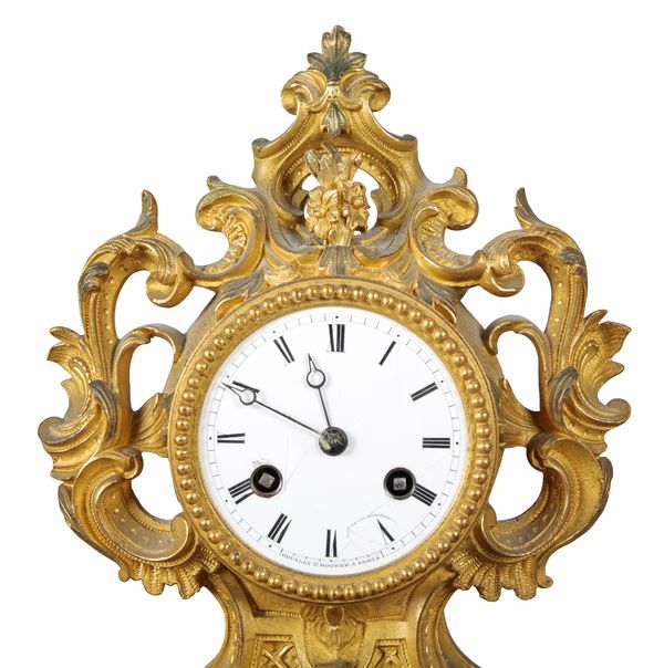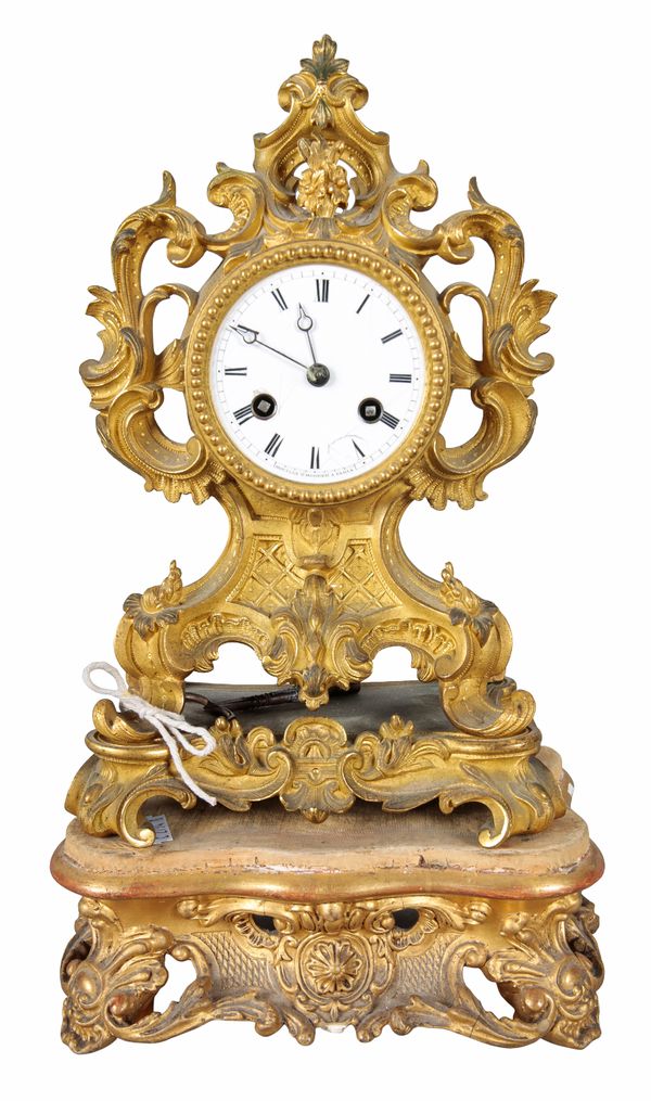 A FRENCH GILT METAL MANTEL CLOCK BY ROUILLY & HOOKER OF PARIS