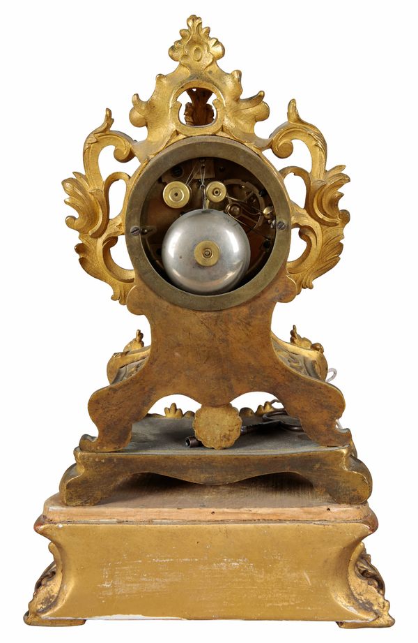 19th century, the two train movement striking on a bell, the white enamel dial with Roman numerals, the case with pierced rococo scrolls and floral cresting, 26cm high, on a giltwood stand bearing an old label to the underside, 33cm high overall (2)