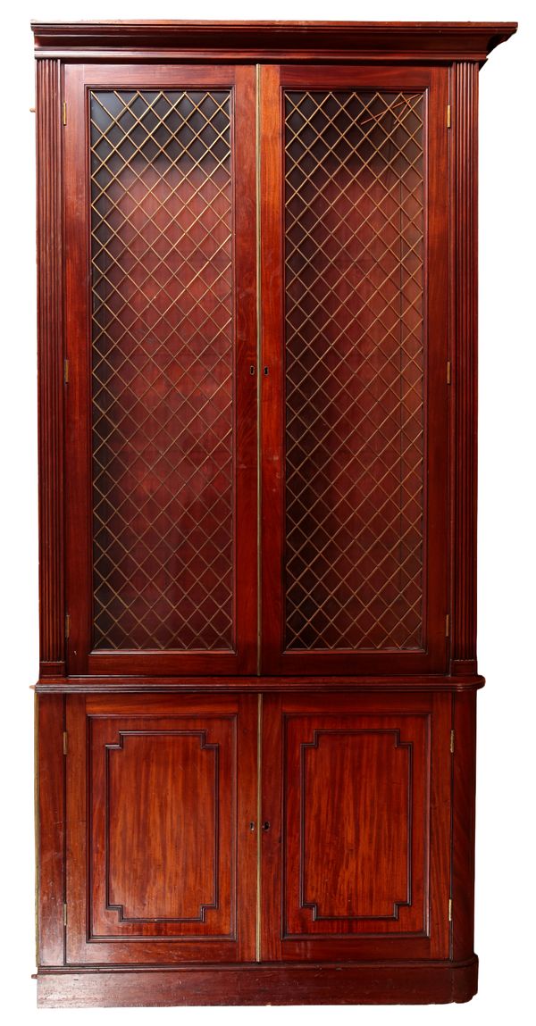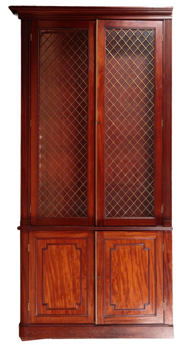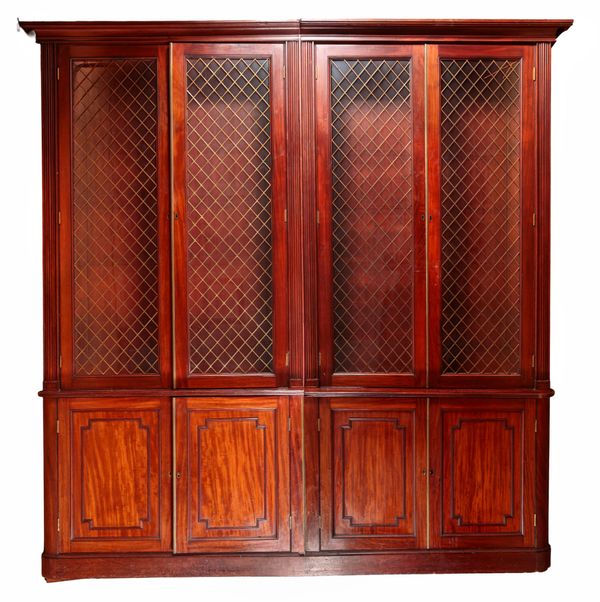 with moulded cornice, fitted ten shelves, enclosed by two pairs of glazed brass grilled doors, above two pairs of panelled doors, on plinth base, 260cm high x 252cm wide x 36cm deep (in two vertical sections)