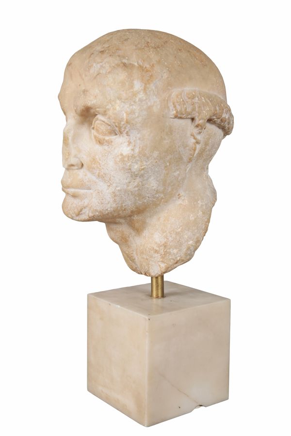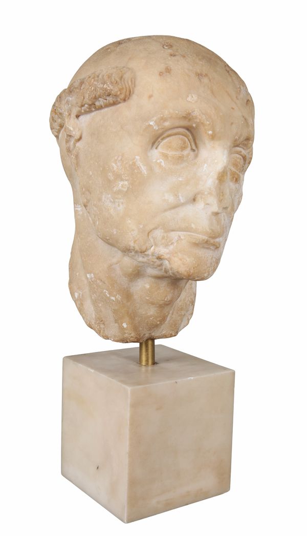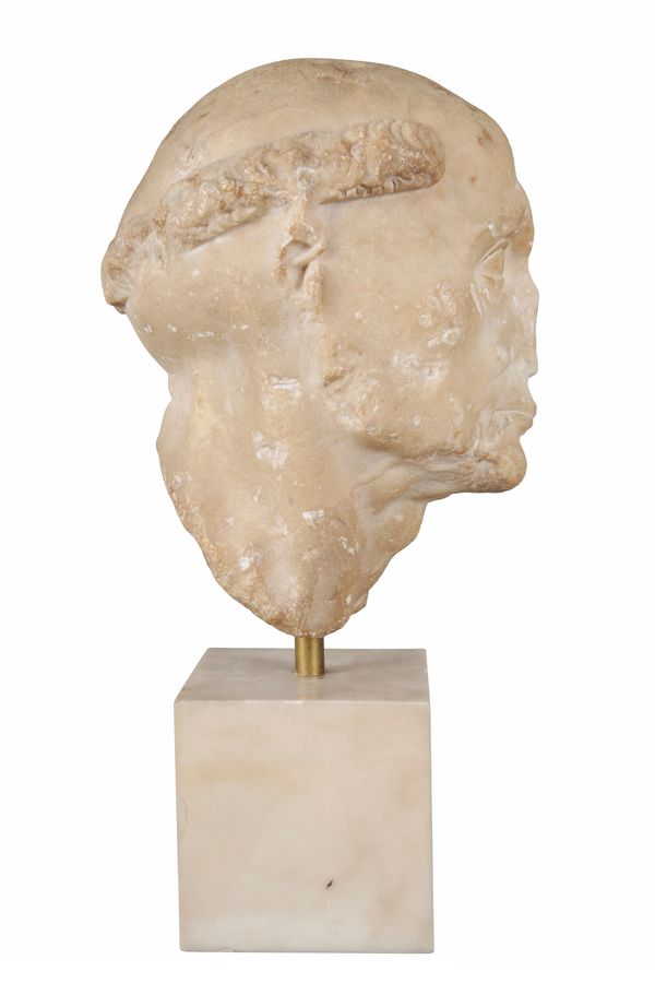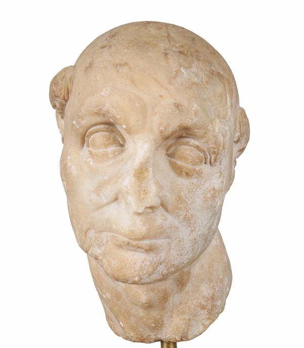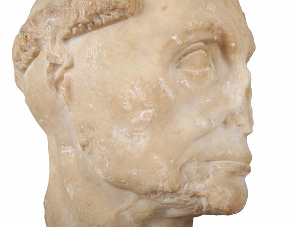 This exceptionally rare depiction of an early medieval monk appears to have been carved using a Roman marble head, most likely dating from the early part of the 1st century. The characterisation of the facial features is typical of Roman works at this time. The portrait has then been later altered to reflect the identity of another European cultural group. It may thus be compared to a Roman marble head of a German, which depicts the sitter with his hair tied in a Suebian knot, found in Somzée, Belgium, datable to 1st/2nd century, and now in the Royal Museum of Fine Arts of Belgium, Brussels. The repurposing of Roman figures is seen throughout Europe during the early Medieval era, perhaps most obviously in the Roman marble head of a goddess, defaced and carved with a cross, presently in the Museum of Samos in Greece.