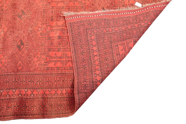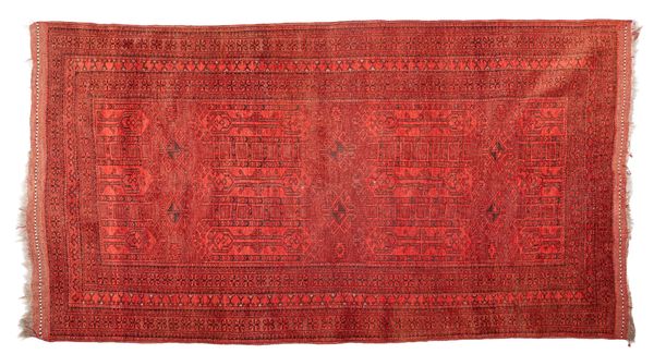 20th century, the red ground decorated with a repeating geometric pattern within conforming borders, 207cm x 115cm