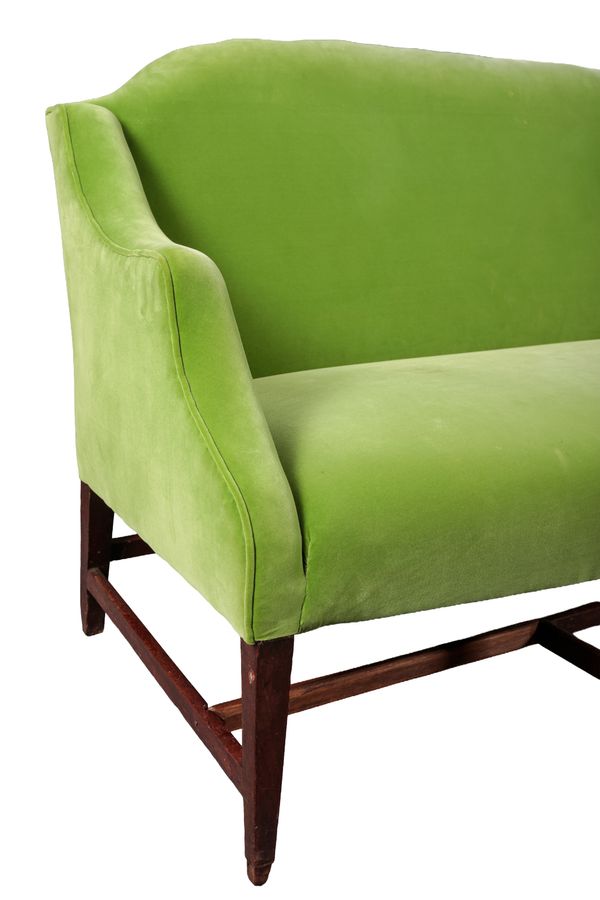 the shaped back, outswept arms and bowfront seat covered in stuffed green velvet, on tapered square legs joined by stretchers, 97cm high x 200cm wide