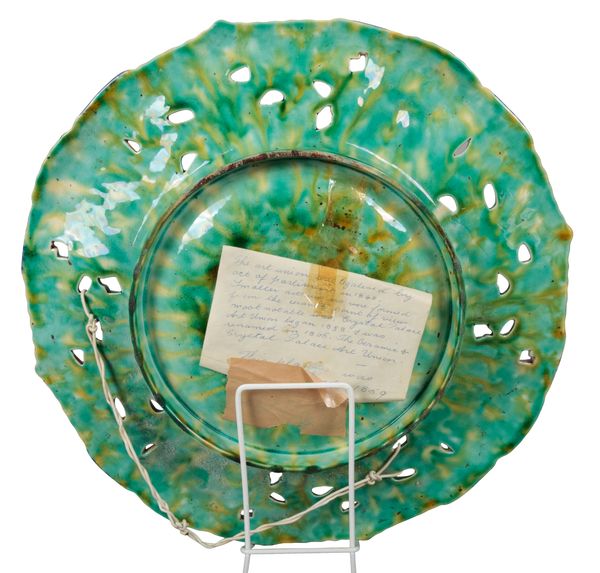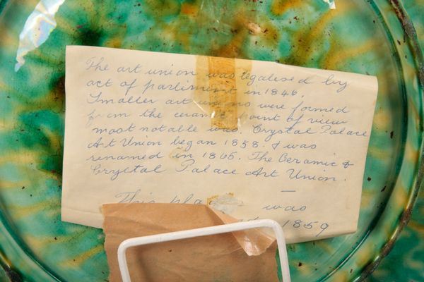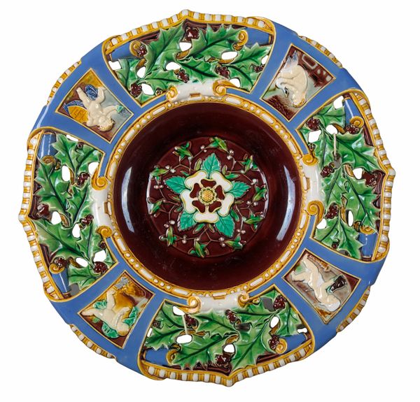 marked to the base, decorated with a flower to the recessed centre, four figural vignettes and a holly border, one of the cherubs holding a 'Crystal Palace Art Union' shield, 39.5cm diameter
