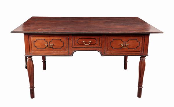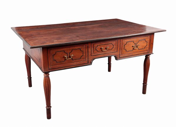 possibly Ceylonese, the three plank rectangular top with ebony border over three short ebony strung frieze drawers, on reeded tapered legs, 79cm high x 153cm wide x 98.5cm deep