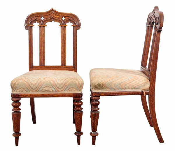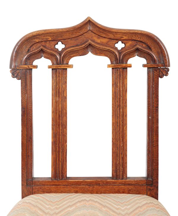 A SET OF SIX VICTORIAN GOTHIC REVIVAL OAK DINING CHAIRS
