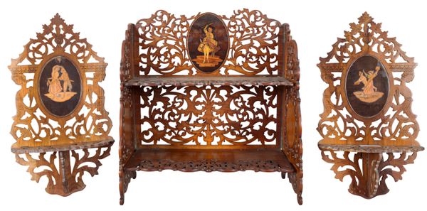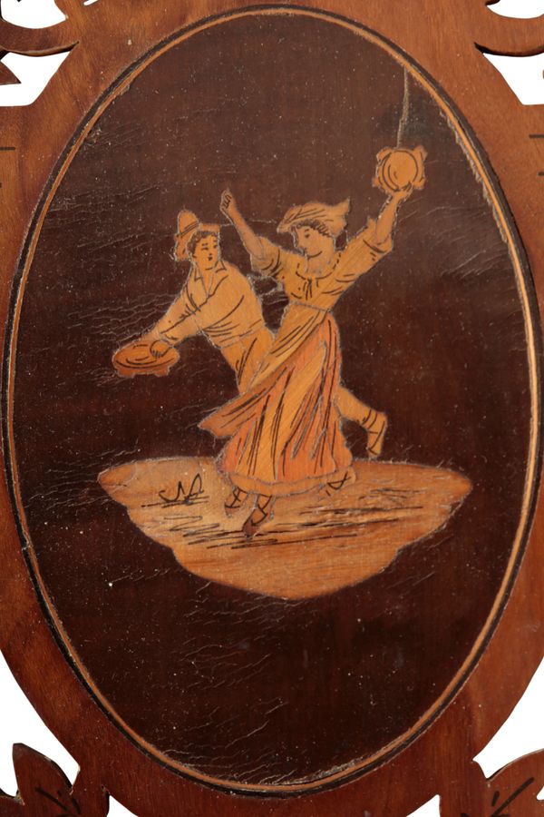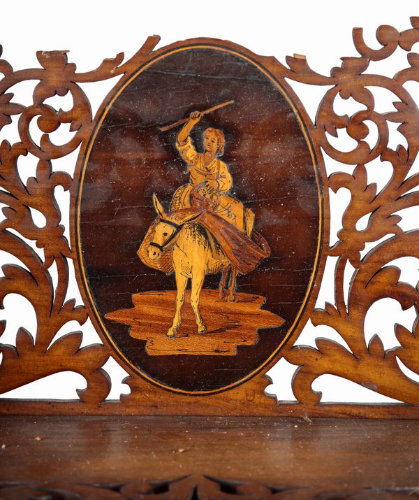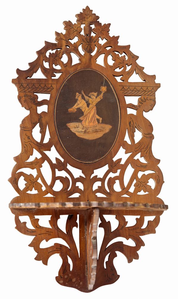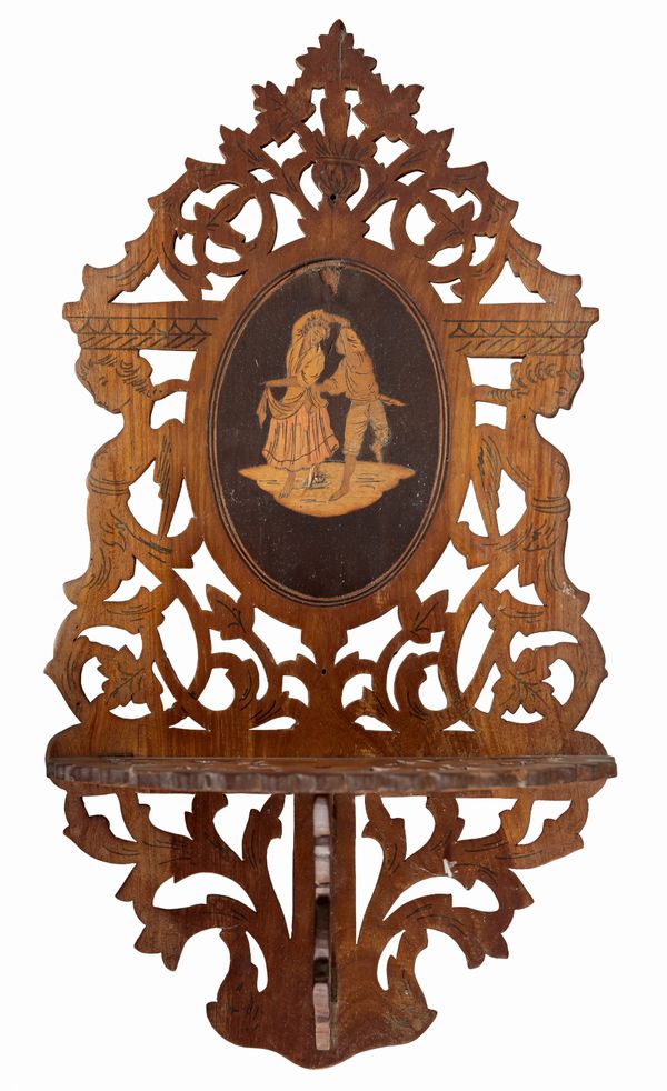 with an oval panel to the cresting inlaid with a figure on a donkey, 38cm high x 35cm wide; together with a pair of similar wall brackets, 20cm (3) Provenance: Dewlish House, Dorset.
