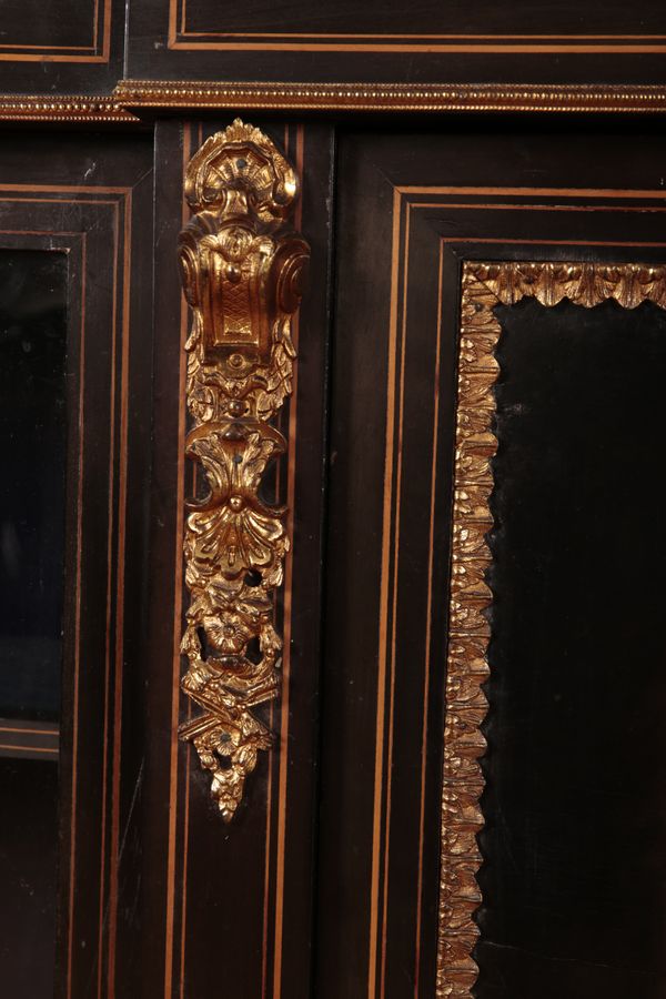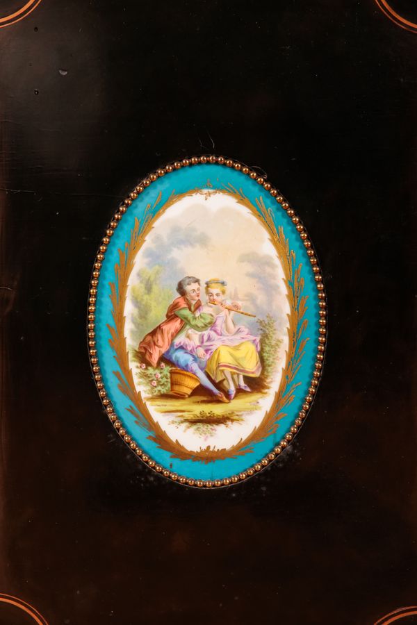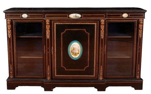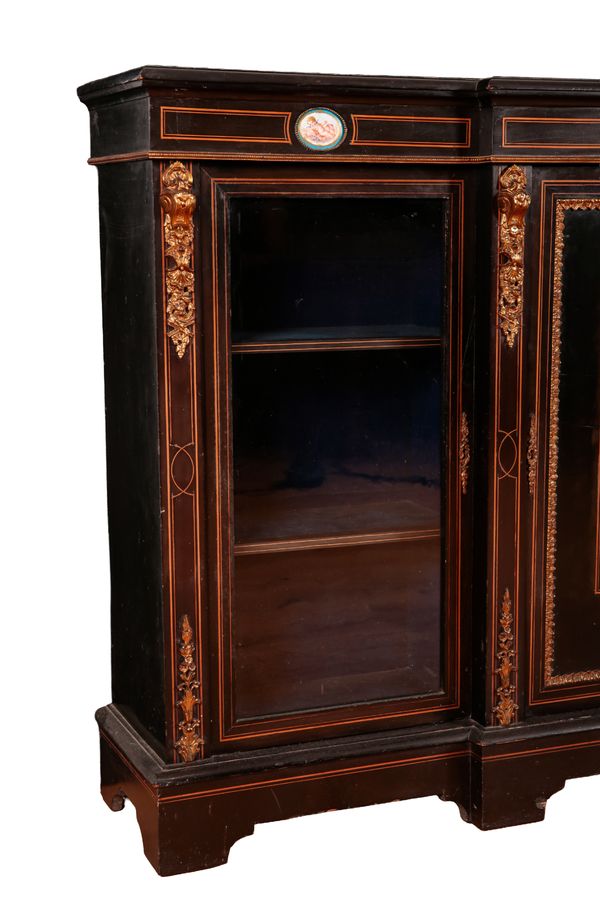 with gilt-metal mounts and stringing, decorated with porcelain plaques of cherubs and courtiers about their leisurely pursuits, the central cupboard and two glazed doors opening to shelves, on a stepped plinth base, 104cm high x 170cm wide x 35cm deep (with key)