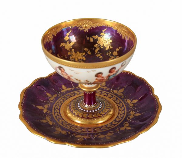 bearing an underglaze shield mark to the base enclosing a 'W', the base further illustrated with a gilt rose, the raised cup displaying a continuous scene of cherubs on a lustrous plum ground enriched with floral gilding, 9cm high x 13.5cm diameter
