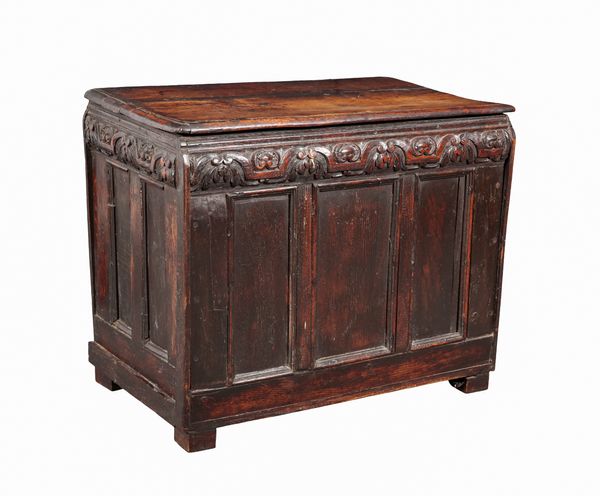 18th century and later, the hinged top opening to a vacant interior, with a foliate carved frieze and panelled sides, 61cm high x 74cm wide x 45cm deep