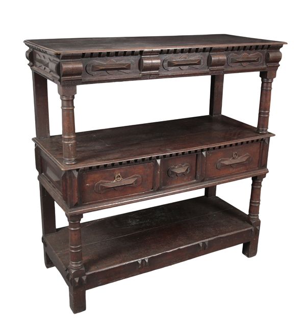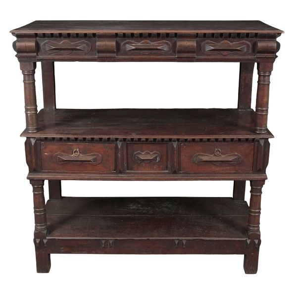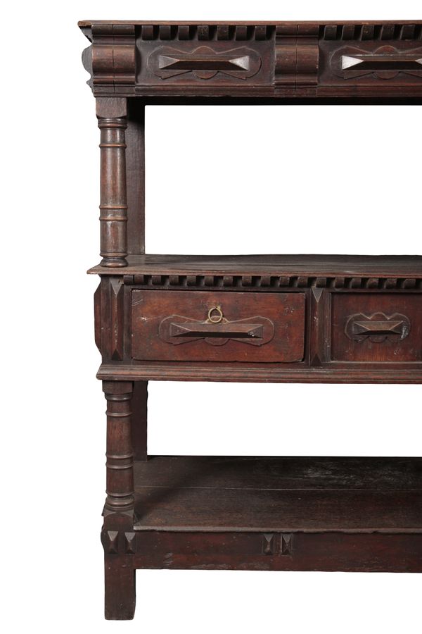 the upper section with a geometrically moulded frieze, two short drawers to the middle, on turned front supports terminating in block legs, 108cm high x 105cm wide x 44cm deep Provenance: Dewlish House, Dorset.