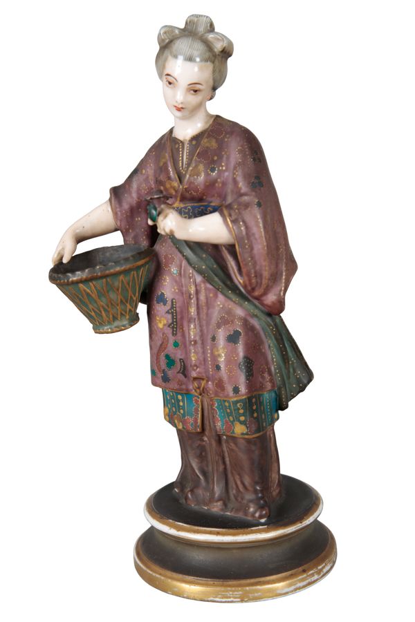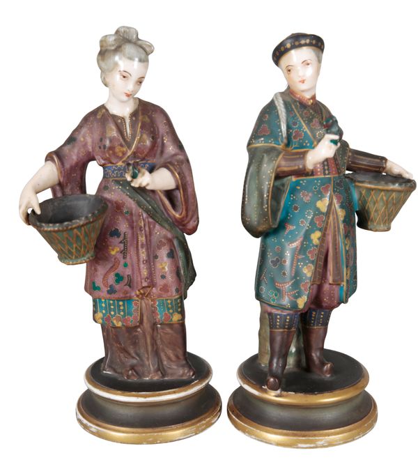 each bearing blue crossed swords and star marks to the base, late 19th century, modelled wearing brightly coloured traditional garb and holding baskets, 20.5cm high (2)