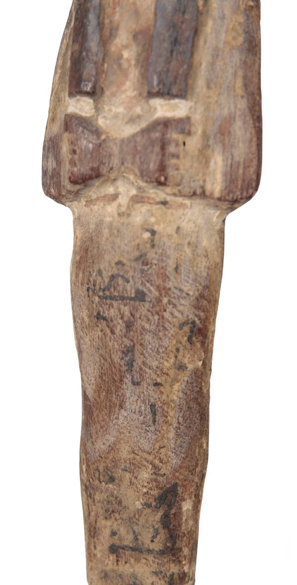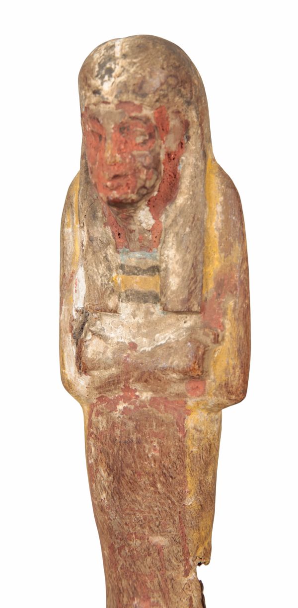 TWO SIMILAR ANCIENT EGYPTIAN CARVED WOOD AND POLYCHROME PAINTED SHABTIS