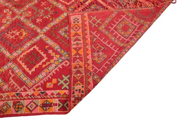 20th century, the red ground decorated in bright colours with an all over geometric pattern, 289cm x 183cm