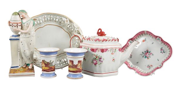late 18th century and later, comprising a moulded pearlware teapot with red swan finial, 18cm high x 23cm long x 13cm wide, a Staffordshire figure, 25cm high, and four further similar examples (6)
