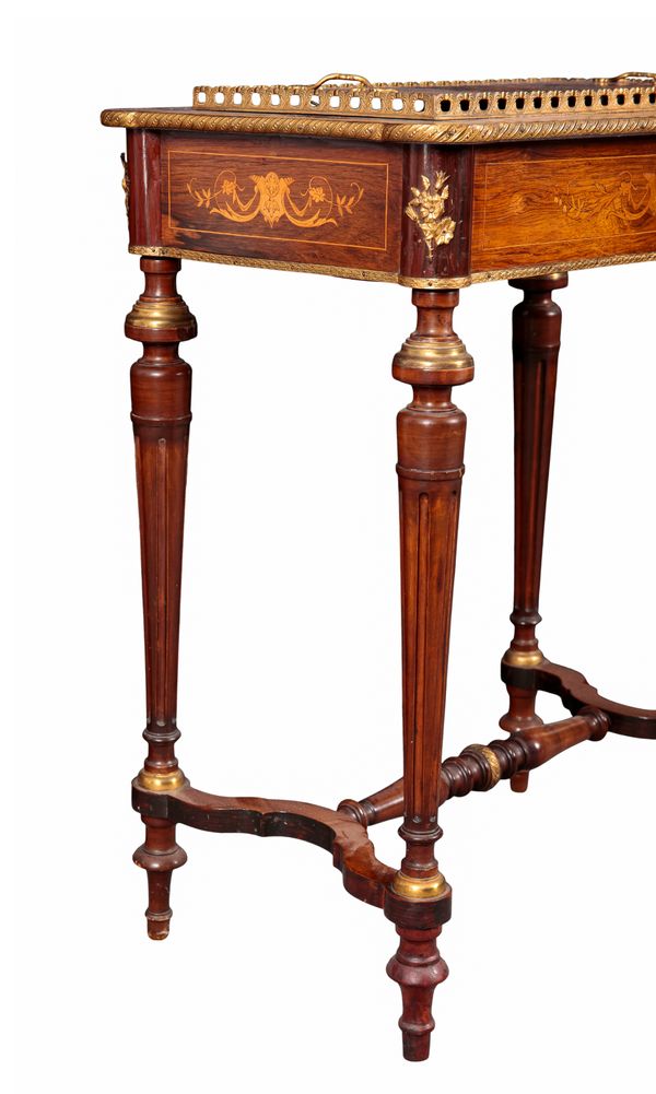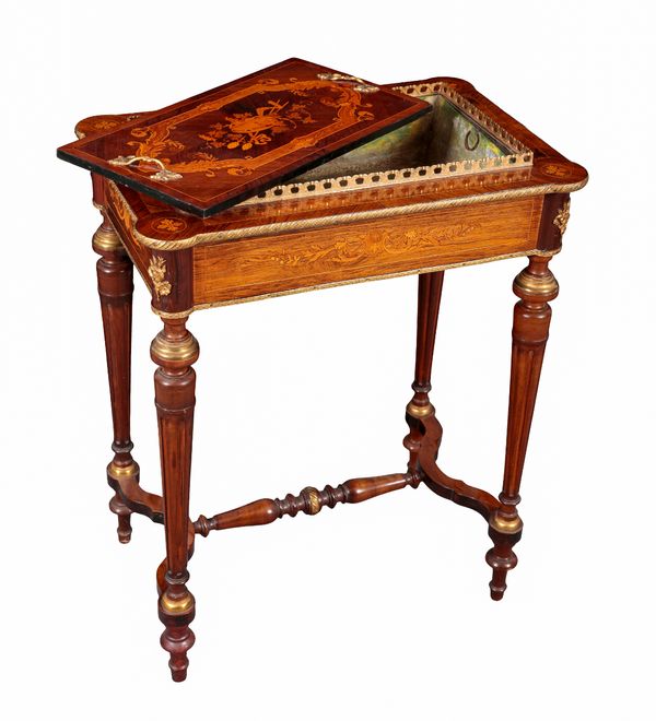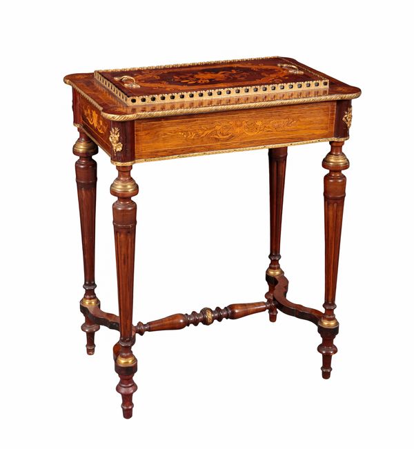 19th century, the top with a lifting panel opening to a drop-in metal lined interior, inlaid with marquetry neoclassical trophies and fitted with gilt-metal mounts, on fluted legs united by a turned stretcher, 77cm high x 60cm wide x 39cm deep