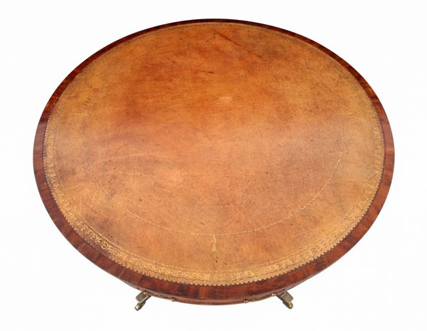 the gilt tooled leather top over four frieze drawers, on a turned stem and four downswept legs terminating in brass toes and castors, 78cm high x 89cm diameter