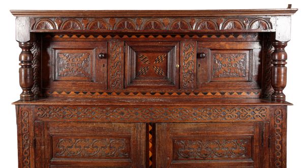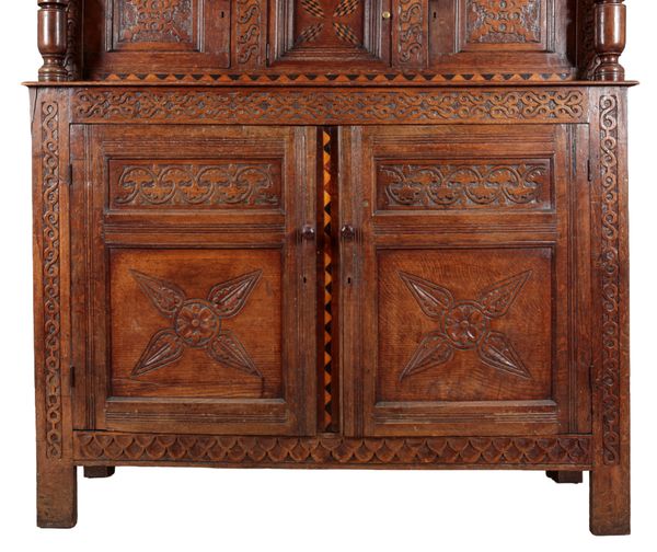 AN ENGLISH OAK AND PARQUETRY COURT CUPBOARD