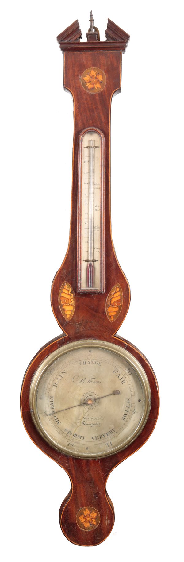 A LATE GEORGE III MAHOGANY AND MARQUETRY BAROMETER