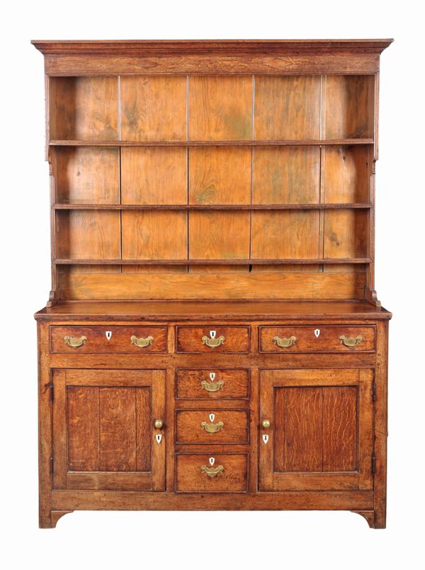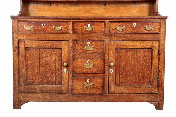 18th century, the upper section with a moulded cornice over a frieze inlaid with two rhombus, three graduated shelves beneath, the base with an arrangement of three short drawers over two cupboards and a central column of faux drawers, on block feet with shaped corner brackets, 205cm high x 153.5cm wide x 48.5cm deep