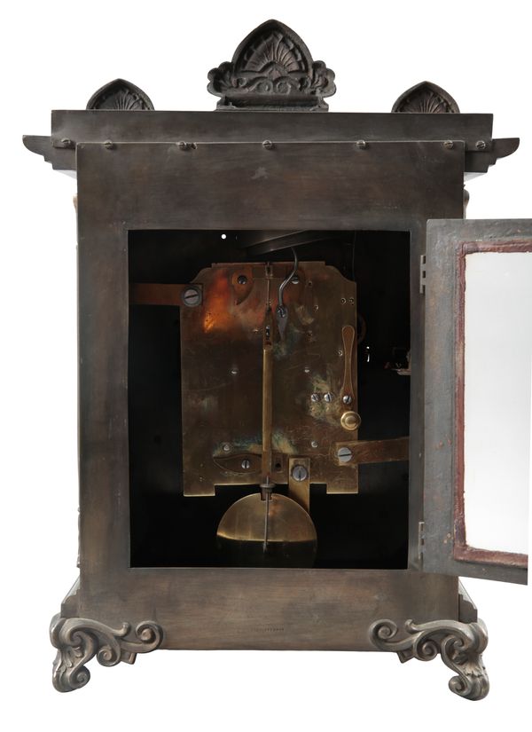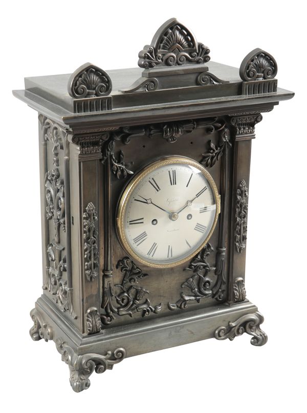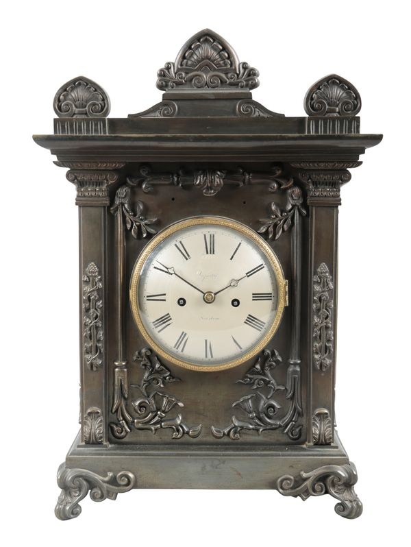 19th century, the two train fusee movement striking on a bell, the silvered dial with Roman numerals, the architectural case stamped 'Fletcher & Day' to the reverse, with an anthemion cast pediment, columns to each side and scrolled bracket feet, 51cm high x 35cm wide x 19cm deep