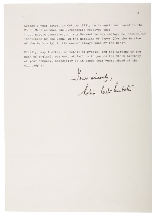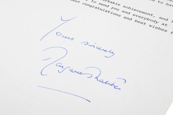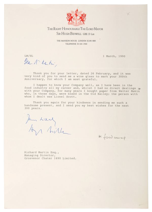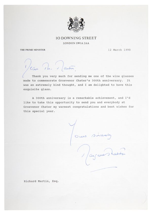 Provenance: These glasses by family descent to the present vendor including the Grosvenor Chater commemorative glass which is sold with three letters dated 1990 from high profile individuals (respectively Margaret Thatcher, Lord Mayor Sir Hugh Bidwell and Bank of England Governor Robin Leigh-Pemberton) to whom these glasses were sent.