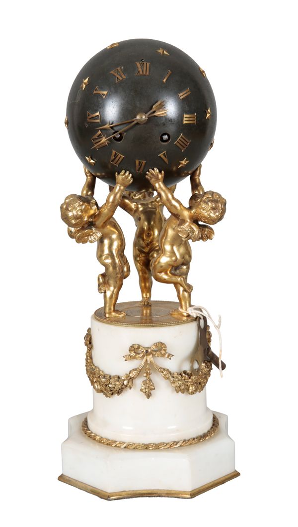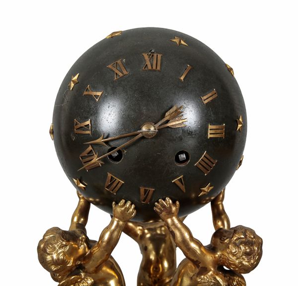 19th century, the two train movement striking on a bell, the backplate stamped and numbered, housed within a spherical globe decorated with stars and a dial with Roman numerals, supported in the arms of three gilt metal putti atop a stone plinth adorned with floral swags, 37cm high