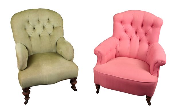 one covered in button back green velvet, 87cm high x 64cm wide, the other in pink button back covers, 88cm high x 77cm wide (2) Provenance: Coventry Lodge, Corfe Mullen.