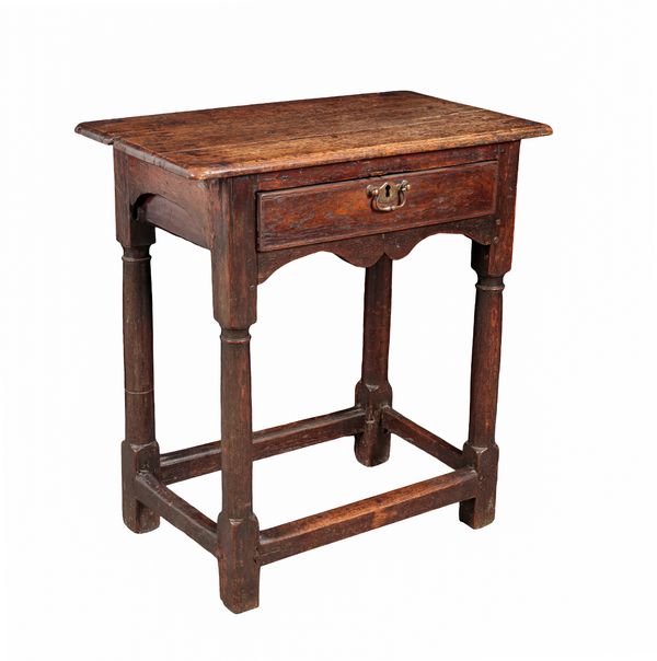 18th century, the rectangular plank top over a single frieze drawer and shaped apron, on turned legs joined by stretchers, 65cm high x 61cm wide x 37cm deep