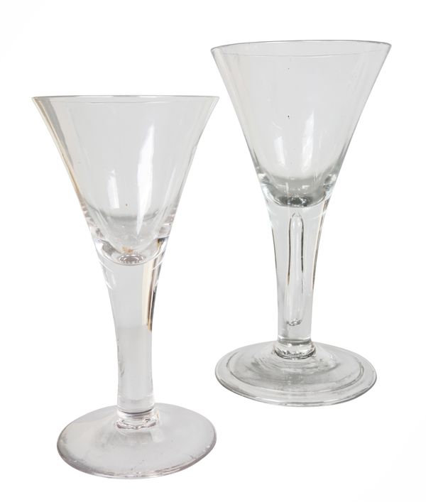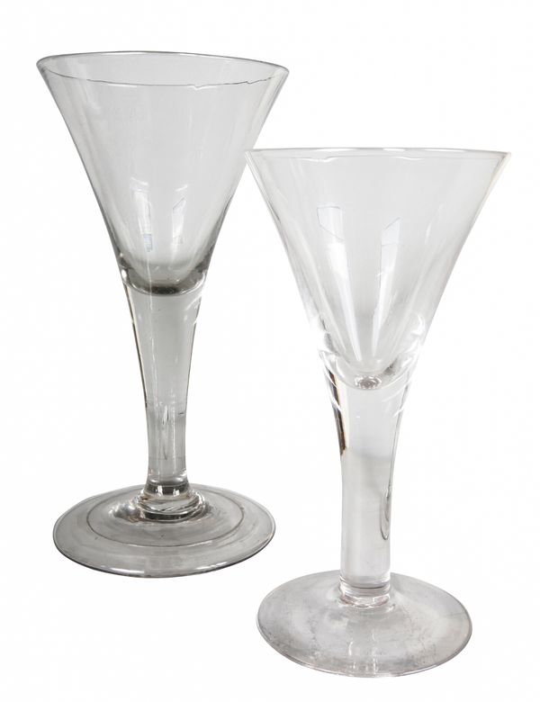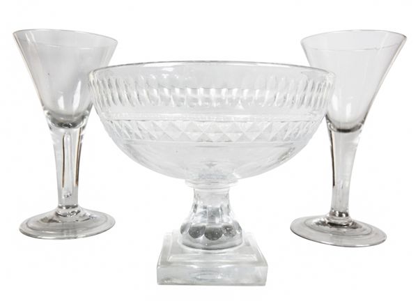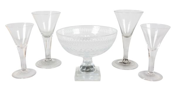 possibly 18th century, raised on folded feet with teared stems and drawn trumpet bowls, the largest measuring 25cm high; together with two later examples; and a cut glass pedestal bowl, 19cm high x 23cm wide (5)