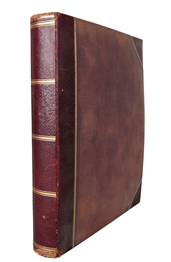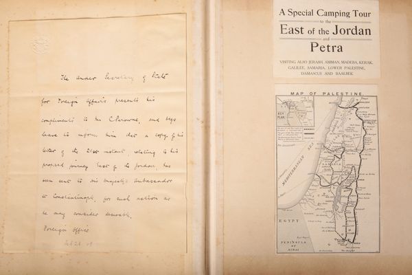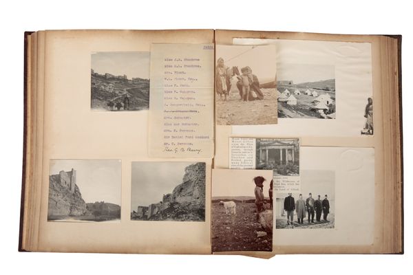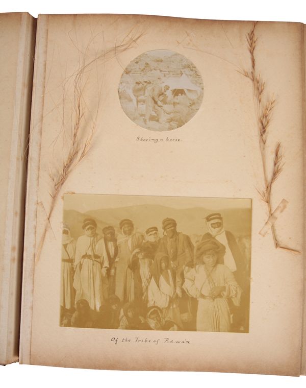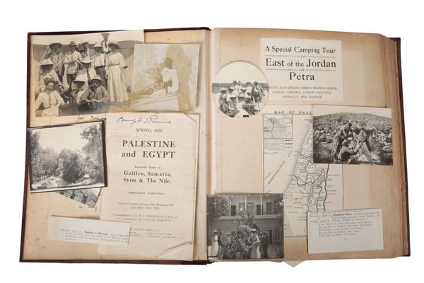 an early 20th century maroon three quarter leather bound photograph album containing a series of pasted sepia photographs, mostly annotated, of the trip undertaken by the Perrone family, the inside front cover with a letter from The Foreign Office dated Feb 28 ‘08 pasted in, with an annotated brochure for Lunn’s Spring 1924 Palestine and Egypt tours