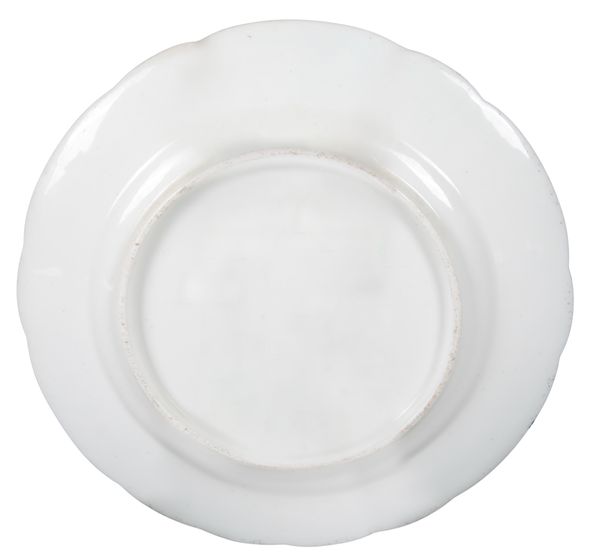 bearing an imprinted numeral to the base, decorated with fruit and flowers to the centre, within a shaped border, 25.5cm diameter
